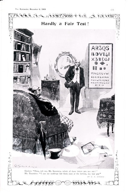 Oculist: "Now, tell me, Mr. Ikenstein, which of these letters you can see?" Mr. Ilkenstein: "I can see noddings but them ones at the bottom, my tear poy"