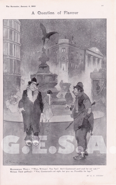 Montmorency Weary: "What, William! You 'ere! Ain't Camberwell good enuf for yer nah?" William Tired (puffing): "Yus, Camberwell's orl right, but give me Piccadilly for fags"