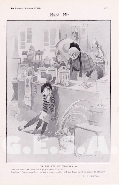 On The Eve of February 14 Mrs. Jumbles: "And what can I get you to-day, Frankie?" Frankie: "Please, mum, have you got a penny valentine with two hearts on it, as rhymes to 'Melia?"