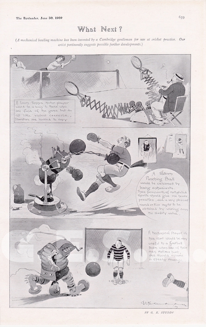 (A mechanical bowling machine has been invented by a Cambridge gentleman for use at cricket practice. Our artist pertinently suggests possible further developments.)