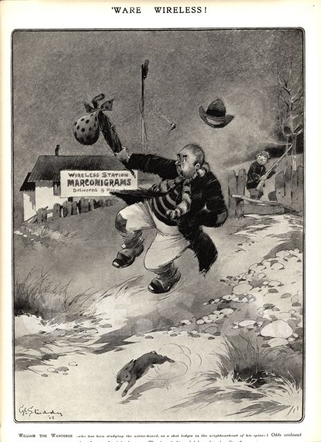 William the Wanderer (who has been studying the notice-board, as a shot lodges in the neighbourhood of his spine): Odds confound there 'ere noo-fangled telegrams. The darned things 'adn't oughter be allowed.