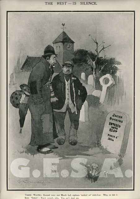 Torpid Walter: Entered inter rest March forf, eighteen 'undered an' sixty-four. Why, so did I! Busy 'Erbert: Pinch yerself, silly. You ain't dead yet. Torpid Walter: Corse not; that's the day I was born.