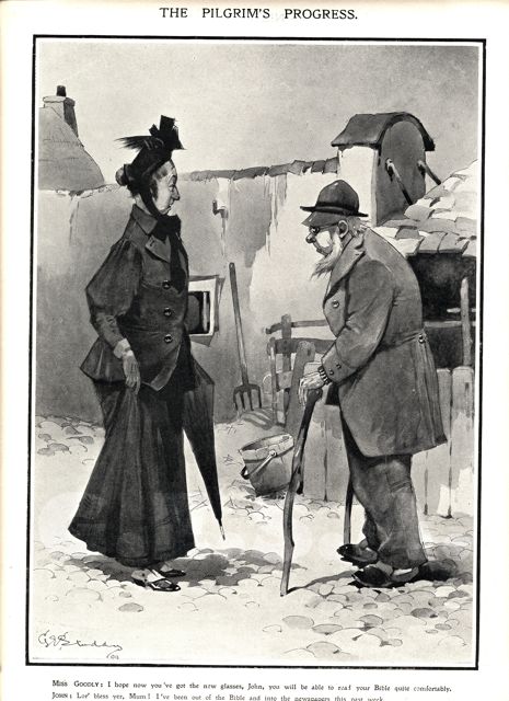 Miss Goodly: I hope now you've got the new glasses, John, you will be able to read your Bible quite comfortably. John: Lor' bless yer, Mum! I've been out of the Bible and into the newspapers this past week.