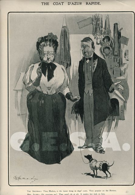 The Shopman: That, Madam, is the latest thing in dogs' coats. Very popular on the Riviera. Mrs. Slowe: Oh, gracious, no! That won't do at all. It makes her look so fast.