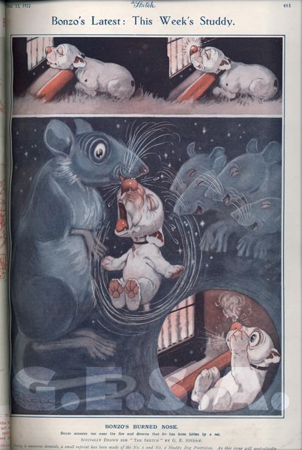 Bonzo snoozes too near the fire and dreams that he has been bitten by a rat.