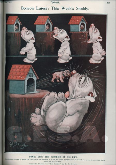 Bonzo introduces himself to Radio Rex, the electric toy consisting of a dog who jumps abruptly from his kennel in response to any sharp sound acting on his "vibrator".