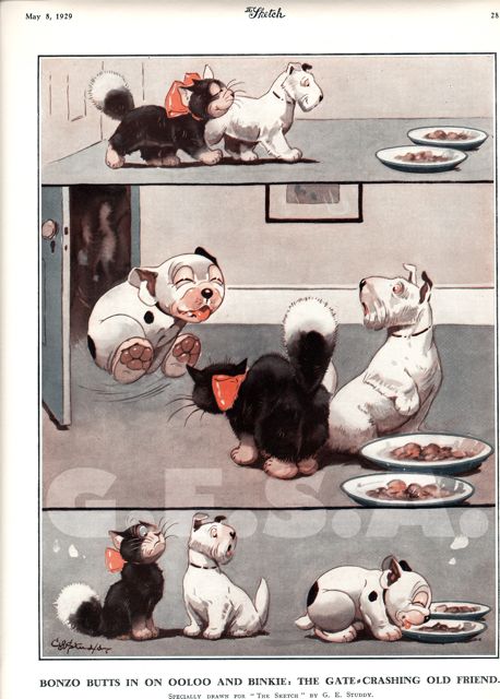 Bonzo butts in on Ooloo and Binkie: The gate-crashing old friend.