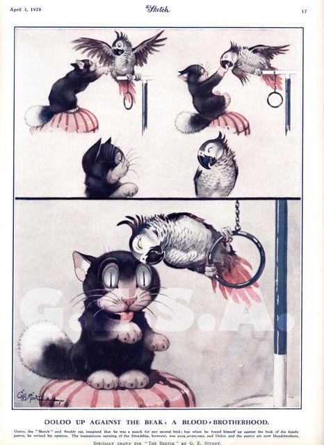 Ooloo, the "Sketch" and Studdy cat, imagined that he was a match for any mortal bird; but when he found himself up against the beak of the family parrot, he revised his opinion. The inauspicious opening of the friendship, however, was soon overcome, and Ooloo and the parrot are now blood-brothers.