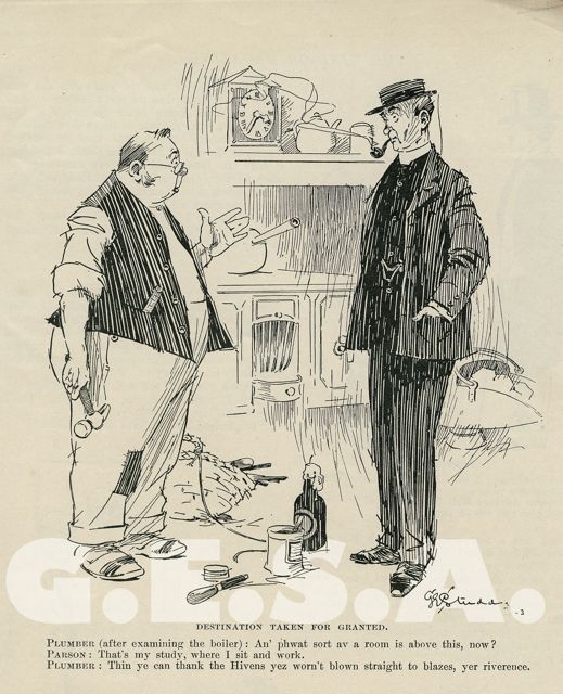 Plumber: Thin ye can thank the Hivens yez worn't blown