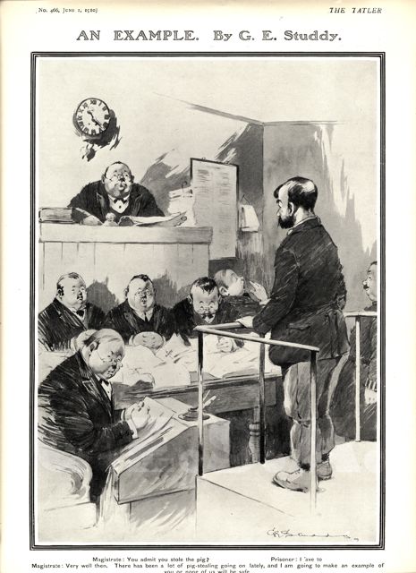 Magistrate: "Very well then. There has been a lot of pig-stealing going on lately, and I am going to make an example of you or none of us will be safe."