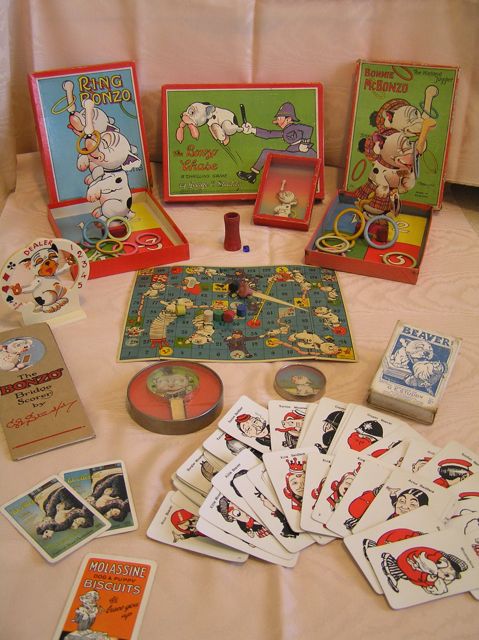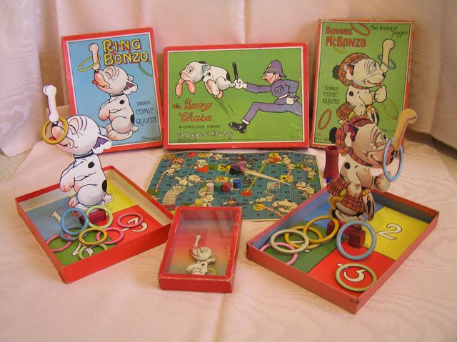 ![]() The Spears Company produced several board or dexterity games. The Bonzo Chase game was based on the traditional Snakes & Ladders game. Several Comic Quoits games were made, including the smaller, sealed box which required the player to shake the rings over the bone balanced on Bonzo's nose. |