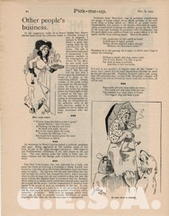 ![]() Published by Pearson between October 1888 - January 1909, Pick-Me-Up magazine was a weekly humourous magazine contianing topical articles & many little cartoons by leading illustrators of the day. It was edited by the Cartoonist Leonard Raven-Hill.