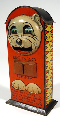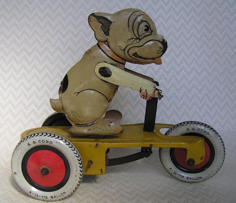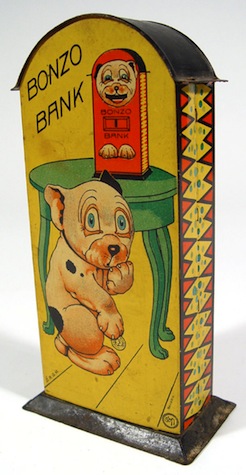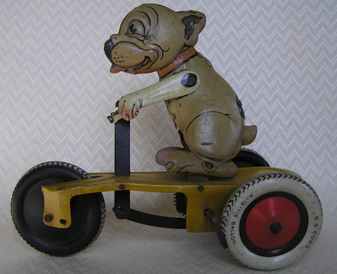 This lovely wind-up toy was made by the Guntherman company. When wound up & released, Bonzo rocks back & forth as the toy runs forward as if pushing it along. |