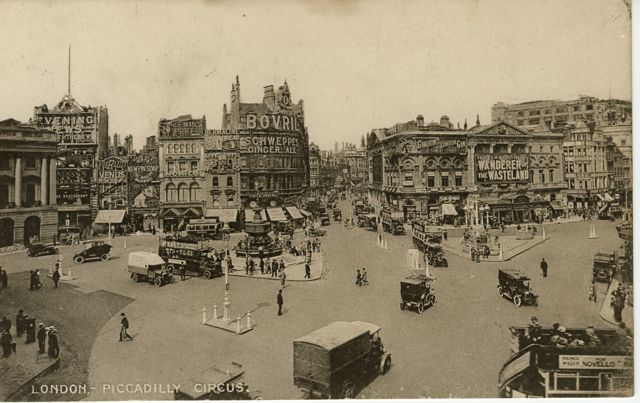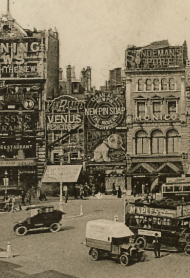 A postcard view of London's Piccadilly Circus circa 1924, showing the Bonzo advertisment in the upper left.