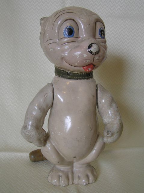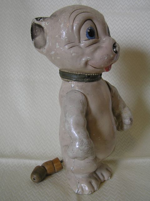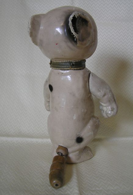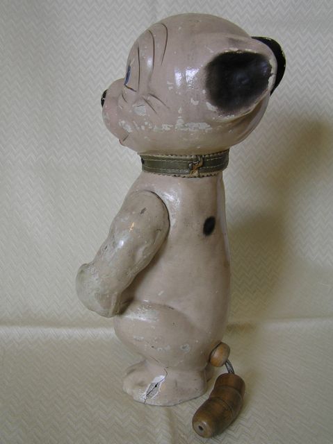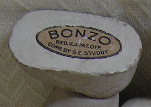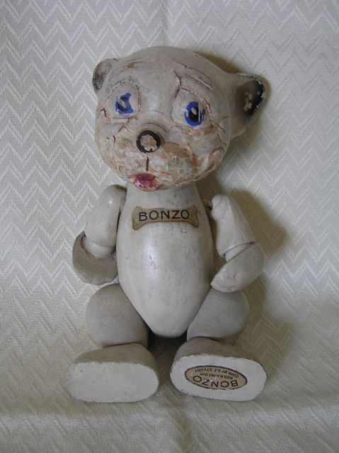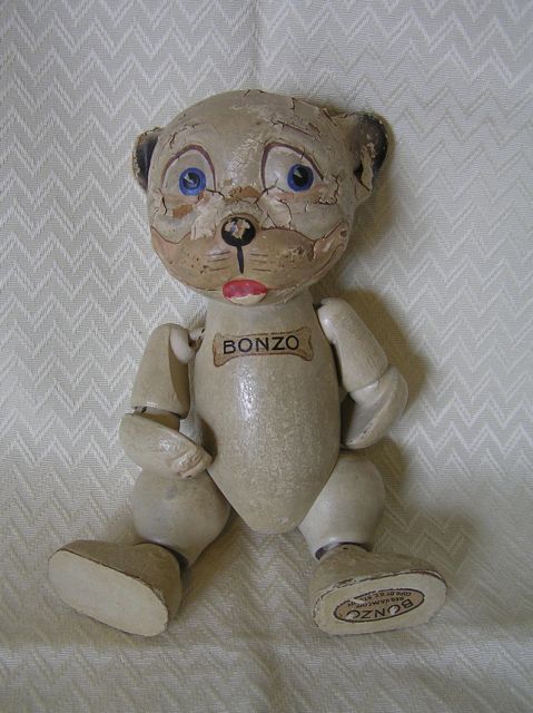 predecessors. The Bonzo they produced in late 1928 appears to be only in one size and is fully jointed. The head is a composition material, with the rest of the body made of a lightweight wood. It is held together by elastic, which in most examples today is somewhat loose. He has his name emblazoned on his chest within a bone, and has an oval decal on the bottom of foot which reads "Bonzo Reg. U.S. Pat. Off. Copr. By G.E. Studdy" so it was an authorized piece. Head to foot, he stands about 7 inches tall, and he is one of the rarer Schoenhut toys to find.