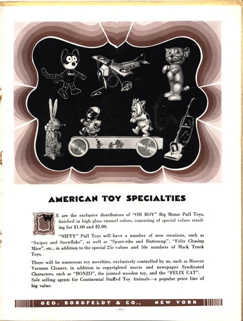 One of the major stockists for the Scoenhut Bonzo was the famous George Borgfeldt & Company store of New York, and they featured the Bonzo in their 1929 catalogue.