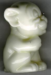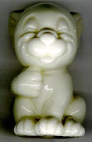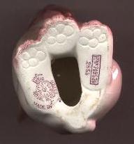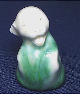 Style three (small mouth) was produced between 1923-36 as HN805B (blue), HN 808 (yellow with brown spots), HN810 (green) and HN812 (Orange). These were smaller in size, 2 inches, and carried the same mark as Style one. It is interesting to note that these figures were also produced to be mounted on a base (perhaps as a calendar, ashtray, etc) as this was common with these small animals produced by Royal Doulton during this period. |