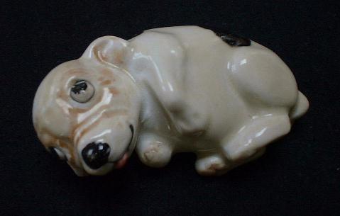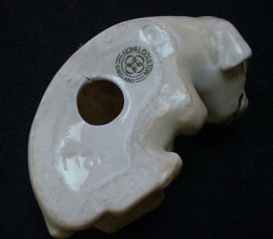 Style one, Bonzo lying down, was produced as HN 804 between 1922-36 and colored in cream with brown spots. It has the abbreviated Royal Doulton Mark (Circle) due to its limited space on the small base. |